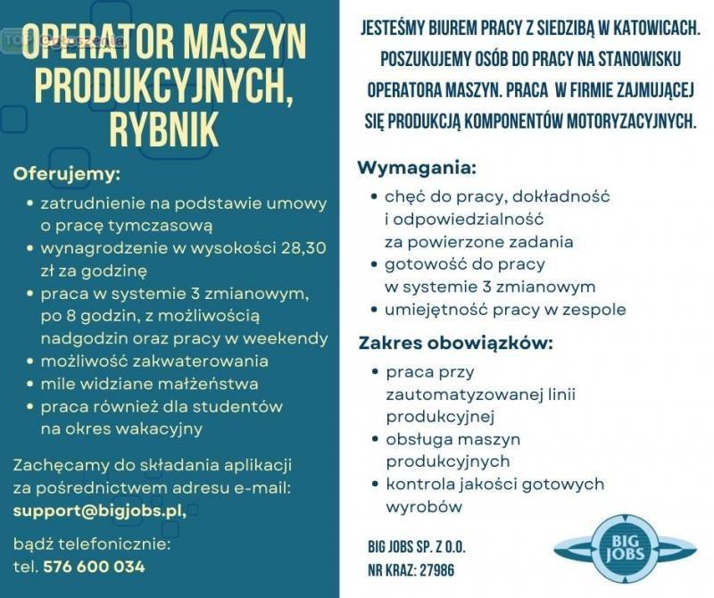 Jesteśmy biurem pracy z siedzibą w Katowicach. Poszukujemy osób do pracy na stanowisku Operatora Maszyn. Praca w firmie zajmującej się produkcją komponentów motoryzacyjnych. Miejsce pracy Rybnik.